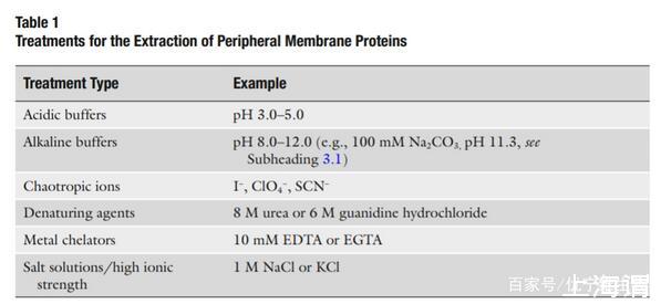 外周膜蛋白可以使用相對溫和的技術(shù)來分離,破壞外周膜蛋白和細(xì)胞膜之間的靜電作用或者氫鍵,而不破壞整個細(xì)胞膜。通常使用的試劑參見表一。使用含有高鹽離子濃度的緩沖液進(jìn)行提取很有用因?yàn)樗麄儠档湍さ鞍缀蛶в须姾傻闹|(zhì)之間的靜電相互作用。