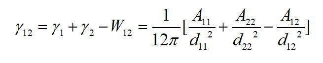 為物質(zhì)1的Hamaker常數(shù)。該作用勢(shì)能就相當(dāng)于本體的內(nèi)聚功。從表面自由能的定義不難看出,當(dāng)將本體沿本體內(nèi)的一個(gè)界面分開(kāi)時(shí),單位面積需要克服內(nèi)聚力所做的功就等于這個(gè)作用勢(shì)能。由于分開(kāi)后形成兩個(gè)新表面,因此每個(gè)表面上的勢(shì)能等于該勢(shì)能的一半。因此物體的表面自由能(表面張力)也等于該作用勢(shì)能的一半,即
