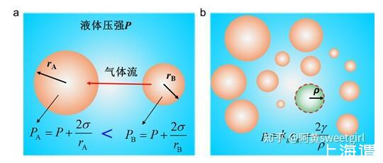 氣泡液體是大小不同的球狀氣泡分散到液體中的液氣體系。在氣泡液體中,大小不同氣泡是一個不穩(wěn)定的體系,其內(nèi)部不等的壓強會使整個體系變化,總體趨勢是氣泡半徑出現(xiàn)粗化現(xiàn)象,這種粗化跟晶體生長中的Ostwald熟化的現(xiàn)象是一致的(Ref 1)。根據(jù)附加壓力公式,可知較小的氣泡其內(nèi)部具有較大的壓強,因此與旁邊較大的氣泡間就會存在壓強差(圖1a),氣泡間液體兩側(cè)的壓強差會使氣體從壓強較大的地方向較小的地方擴散,從而出現(xiàn)大的氣泡增大,小的氣泡減小直至消失的情形,這就是氣泡Ostwald熟化的機理(Ref 2)。從能量的觀點來說,Ostwald熟化的結(jié)果降低了體系的表面能,從而使整個體系更加穩(wěn)定。