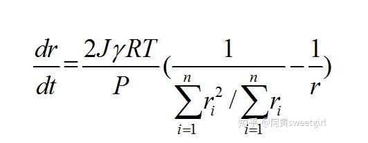 假設氣體符合氣體理想氣體方程,即PV=nRT,對于球形氣泡,體積V=4πr^3/3,從而可把摩爾速率轉(zhuǎn)化為氣泡半徑變化的速率。通過以上各式,可得
