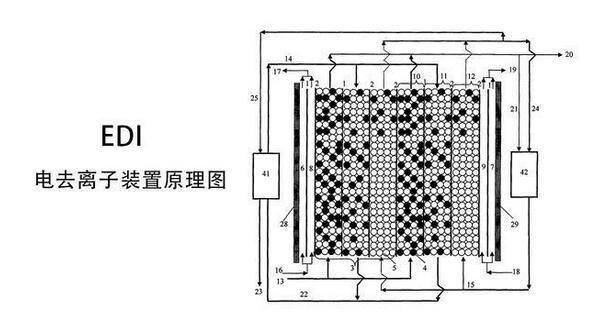EDI進(jìn)水中的陽離子和陰離子跟離子交換樹脂中的氫離子和氫氧根離子交換,形成超純水(高純水)。超極限電流使水電解產(chǎn)生的大量氫離子和氫氧根離子對(duì)離子交換樹脂進(jìn)行連續(xù)的再生,可以連續(xù)工作,不需要酸堿化學(xué)再生。