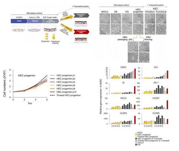 鑒于此,韓國生命工學(xué)研究院的一項研究開發(fā)了一種重復(fù)性良好的兩步方法來誘導(dǎo)人多能干細胞分化為可擴大的hIEC祖細胞和具有功能性的hIEC單層細胞。