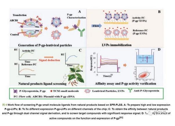 針對慢病毒載體穩(wěn)定技術(shù)結(jié)合SPR在中藥活性成分篩選中的應(yīng)用,本課題組已展開一些探索性研究。P-糖蛋白(P-gp)是體內(nèi)最重要的外排型轉(zhuǎn)運蛋白,具有12次跨膜的復(fù)雜結(jié)構(gòu),且尚未商品化。Cao等[80]采用LVPs穩(wěn)定策略,獲得活性良好的P-糖蛋白,構(gòu)建了一種基于SPR的P-糖蛋白配體篩選系統(tǒng)。首先,獲得P-gp高表達(dá)和低表達(dá)的LVPs,然后將P-gp高/低表達(dá)的LVPs分別固定在CM5芯片上作為活性通道和參比通道。以P-gp抑制劑伐司樸達(dá)(valspodar,Val)和環(huán)孢素(cyclosporin,CsA)為陽性對照,從天然產(chǎn)物庫中快速篩選出厚樸酚、和厚樸酚和白藜蘆醇作為潛在的P-gp配體(圖4)[80]。Chen等[81]構(gòu)建了CXCR4的配體篩選體系,將高/低表達(dá)的CXCR4的慢病毒顆粒固定在CM5芯片上,以趨化因子受體拮抗劑AMD3100為陽性化合物,從川芎提取物中篩選出洋川芎內(nèi)酯Ⅰ為CXCR4的潛在配體。