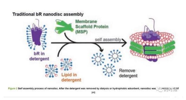 納米盤由磷脂和兩親性螺旋蛋白,也稱膜支架蛋白(membrane scaffold protein,MSP)組成。一般由130~160個磷脂形成含MPs的雙分子層,然后由MSP作為與MPs結(jié)合的疏水基團保持其天然構(gòu)象[38]。單個MPs可形成150 kDa大小的納米盤。組裝納米盤時,首先將MSP按照一定比例與預(yù)先溶解在洗滌劑(通常是膽酸鈉)中的磷脂混合,孵育一段時間后利用透析或疏水吸附劑去除洗滌劑,隨后納米盤自行組裝形成納米級別類膜結(jié)構(gòu)圓盤[39]。組裝包含MPs的納米盤只需在體系中再加入適量MPs,其自組裝過程與空納米盤相似。包含MPs的納米盤與空納米盤通過生化手段進行分離,隨后用分子排阻色譜進一步純化,過程如圖2所示[40]。