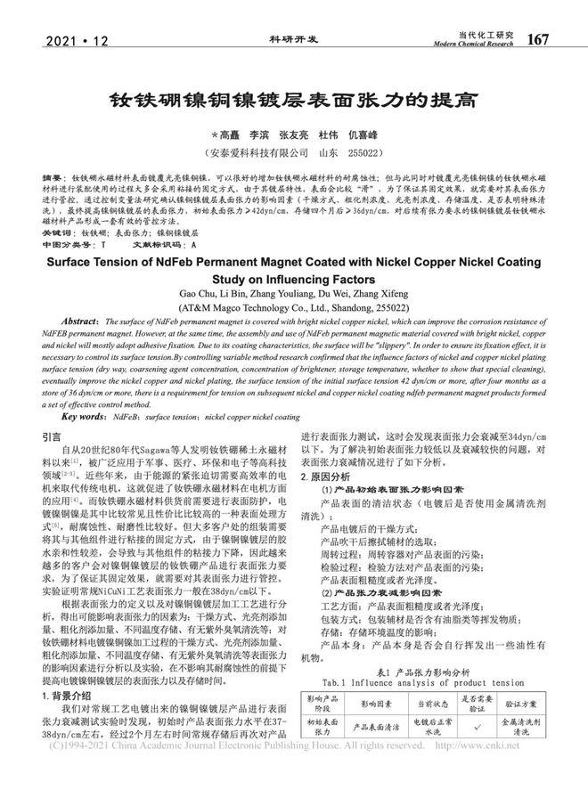 摘要:釹鐵硼永磁材料表面鍍覆光亮鎳銅鎳,可以很好的增加釹鐵硼永磁材料的耐腐蝕性;但與此同時對鍍覆光亮鎳銅鎳的釹鐵硼永磁材料進行裝配使用的過程大多會采用粘接的固定方式,由于其鍍層特性,表面會比較"滑",為了保證其固定效果,就需要對其表面張力進行管控。通過控制變量法研究確認鎳銅鎳鍍層表面張力的影響因素(干燥方式、粗化劑濃度、光亮劑濃度、存儲溫度、是否表明特殊清洗),最終提高鎳銅鎳鍍層的表面張力,初始表面張力≥42dyn/cm,存儲四個月后≥36dyn/cm,對后續(xù)有張力要求的鎳銅鎳鍍層釹鐵硼永磁材料產(chǎn)品形成一套有效的管控方法。