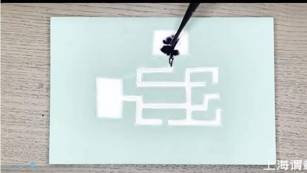 玄機(jī)主要在于后面滴加的染色液體上。可以看出,這個(gè)液體加到迷宮起點(diǎn)之后是會(huì)自動(dòng)選擇“正確的道路”來(lái)前進(jìn)的。雖然液體加太多之后會(huì)溢出到其他死胡同的方向,但是液體前端剛剛到達(dá)分岔路的時(shí)候,可以明顯地看到一個(gè)選擇性拐彎的趨勢(shì),就像下面的動(dòng)圖這樣: