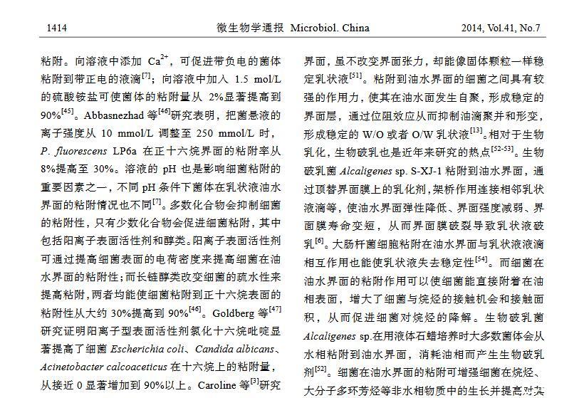 摘 要:細(xì)菌在油水界面粘附主要應(yīng)用于烷烴污染的環(huán)境修復(fù)、石油開采與加工、食品加工等方面,其研究已經(jīng)引起各界的廣泛關(guān)注。本文基于 XDLVO 理論闡述細(xì)菌在油水界面的粘附機(jī)理;總結(jié)細(xì)菌表面特性、油相及水相性質(zhì)對細(xì)菌粘附的影響;介紹細(xì)菌粘附作用在微生物驅(qū)油、生物乳化與破乳以及烷烴降解方面的應(yīng)用,并對今后的研究方向提出展望。