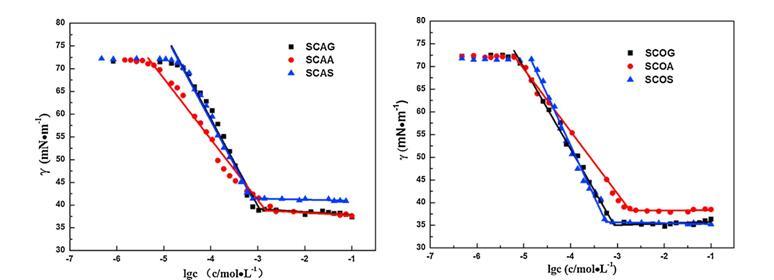 圖1 6種來(lái)自蓖麻油(左)和棉籽油(右)的酰基氨基酸表面活性劑在25°C下的表面張力曲線。畫(huà)線以顯示斷點(diǎn)。