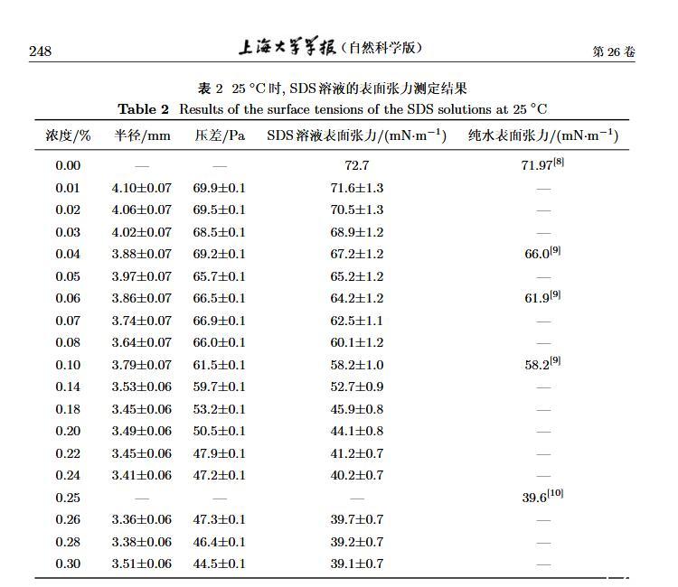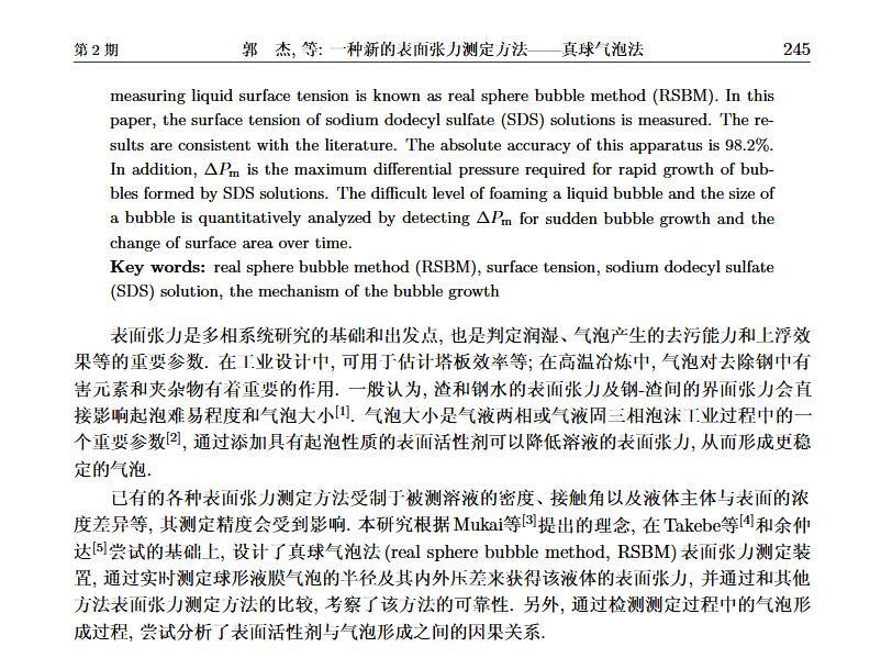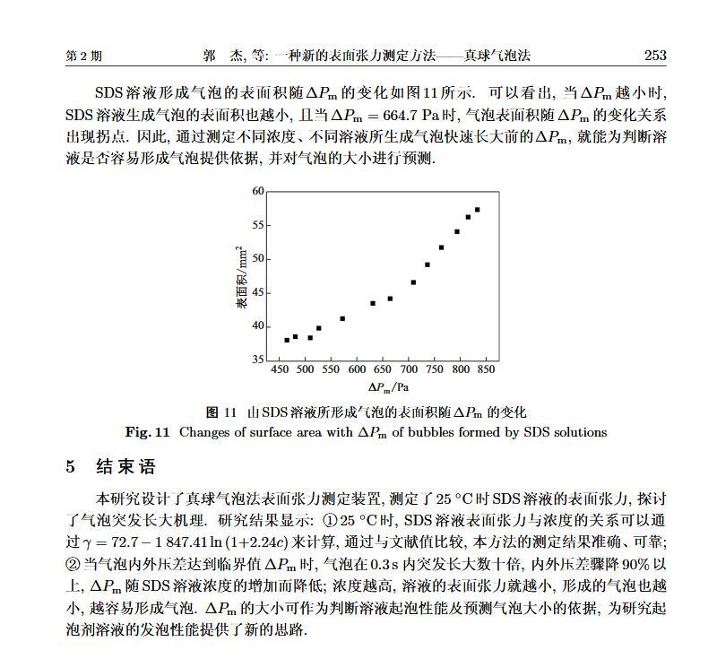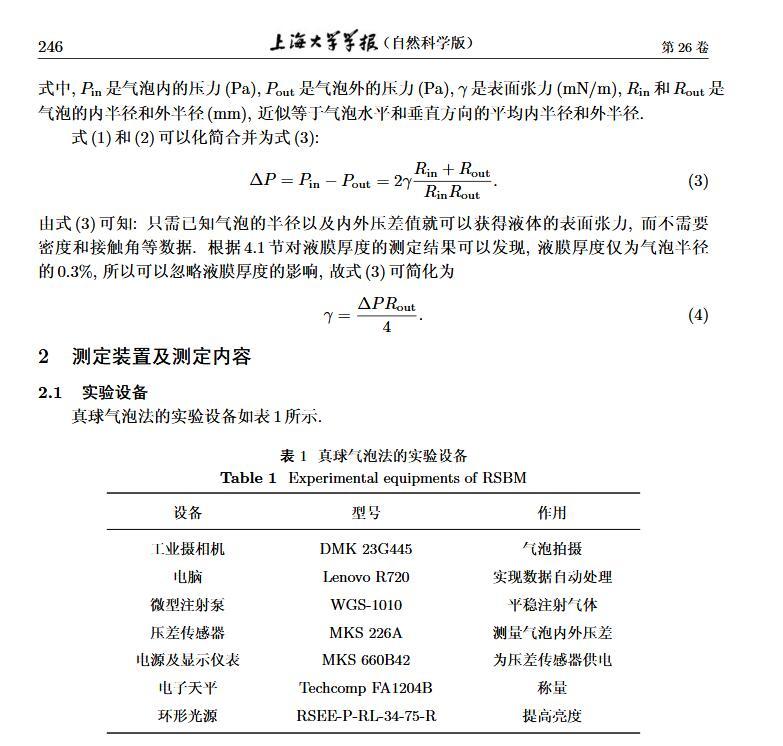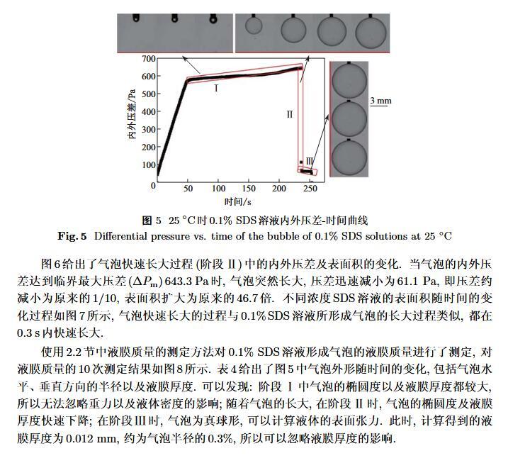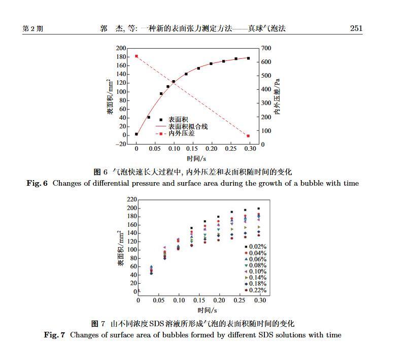 設(shè)計(jì)了一個新的表面張力測定裝置,通過實(shí)時測定液膜氣泡的半徑及其內(nèi)外壓差來獲得被測液體的表面張力。該測定液體表面張力的方法簡稱為真球氣泡法(real sphere bubblemethod,RSBM)。對十二烷基硫酸鈉(sodium dodecyl sulfate,SDS)溶液的表面張力進(jìn)行了測定,結(jié)果與文獻(xiàn)值吻合,且測定裝置的絕對精度為98.2。通過檢測到的液膜氣泡突然長大所需要的最大壓差值及其表面積隨時間的變化過程,定量分析溶液起泡難易程度及氣泡大小的關(guān)系。