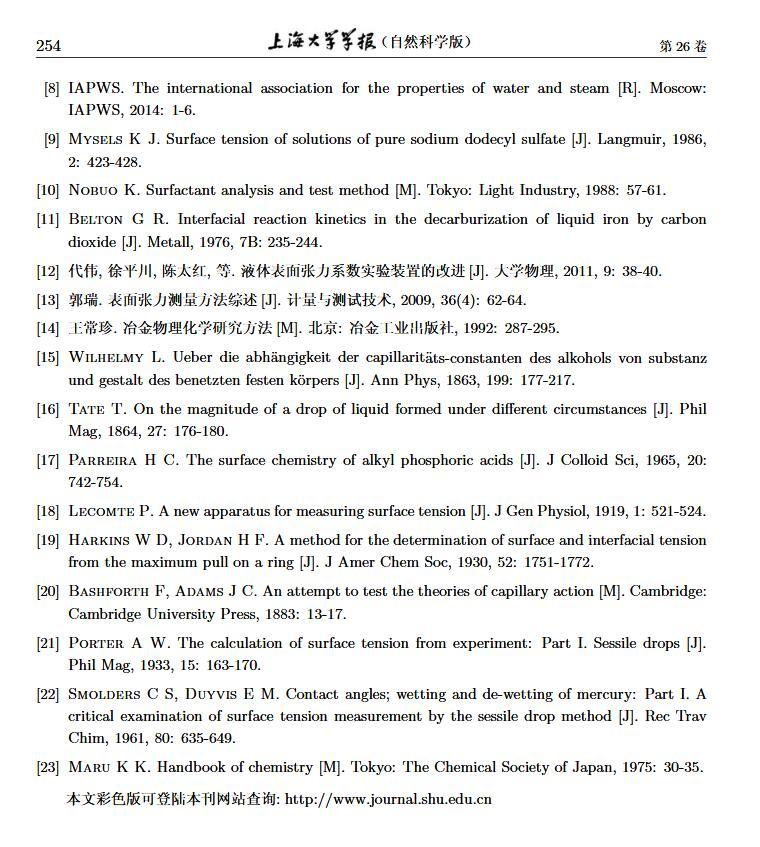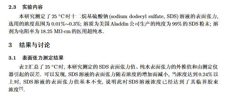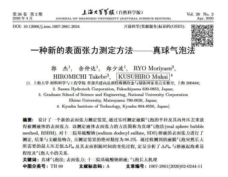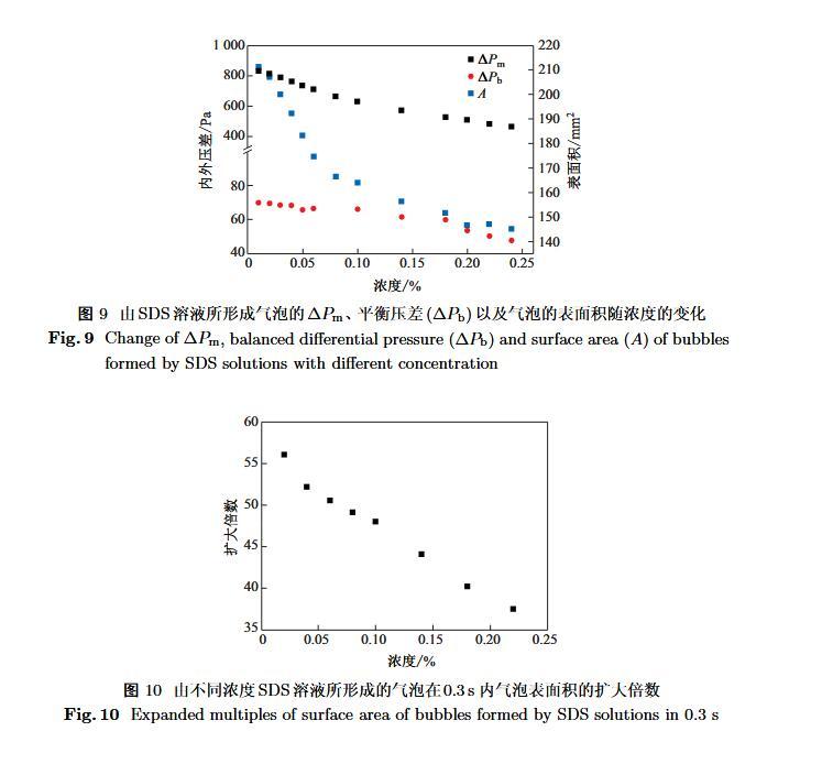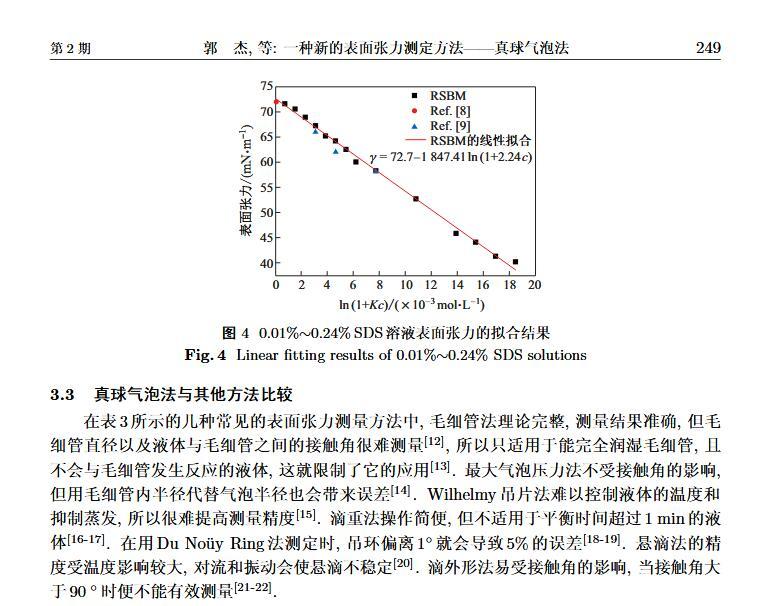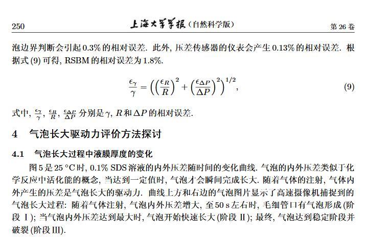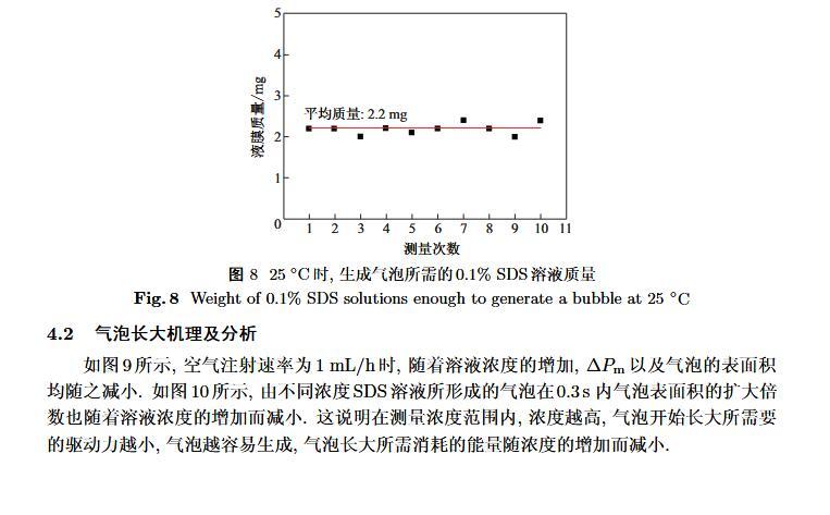 設(shè)計(jì)了一個新的表面張力測定裝置,通過實(shí)時測定液膜氣泡的半徑及其內(nèi)外壓差來獲得被測液體的表面張力。該測定液體表面張力的方法簡稱為真球氣泡法(real sphere bubblemethod,RSBM)。對十二烷基硫酸鈉(sodium dodecyl sulfate,SDS)溶液的表面張力進(jìn)行了測定,結(jié)果與文獻(xiàn)值吻合,且測定裝置的絕對精度為98.2。通過檢測到的液膜氣泡突然長大所需要的最大壓差值及其表面積隨時間的變化過程,定量分析溶液起泡難易程度及氣泡大小的關(guān)系。