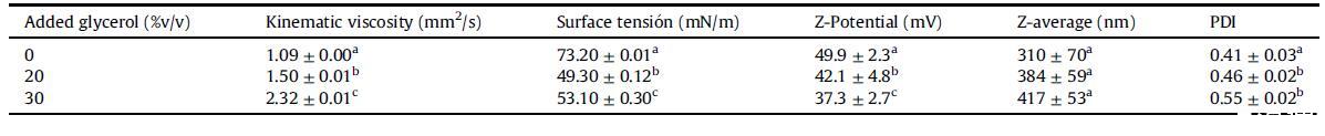 表2甘油對(duì)納米顆粒懸浮液物理性質(zhì)和納米顆粒的粒徑和zeta電位的影響。不同字母表示顯著差異(p<0.05)。