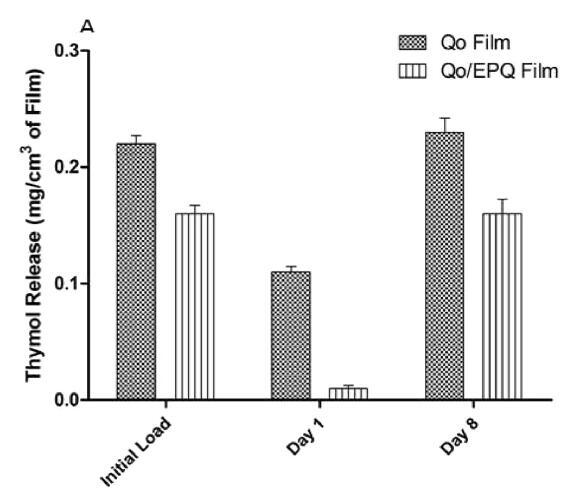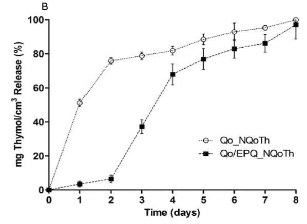 圖6.從使用NQoTh印刷4次的薄膜Qo和Qo/EPQ中釋放百里酚(A)0天(初始負(fù)載Th)、第1天和第8天的釋放曲線和(B)室溫下8天測(cè)定的百里酚釋放動(dòng)力學(xué)溫度。