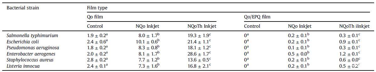 表3注射到薄膜Qo和Qo/EPQ中的百里酚量(mg/cm3)作為印刷次數(shù)的函數(shù)。不同字母表示顯著差異(p<0.05)。