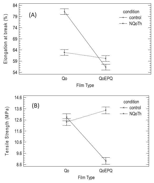 圖5.Type Film和NQoTh之間的相互作用(A)斷裂伸長(zhǎng)率效應(yīng)和(B)拉伸強(qiáng)度效應(yīng)。