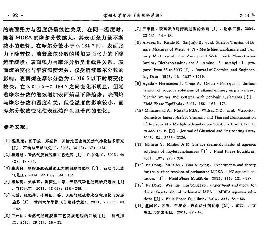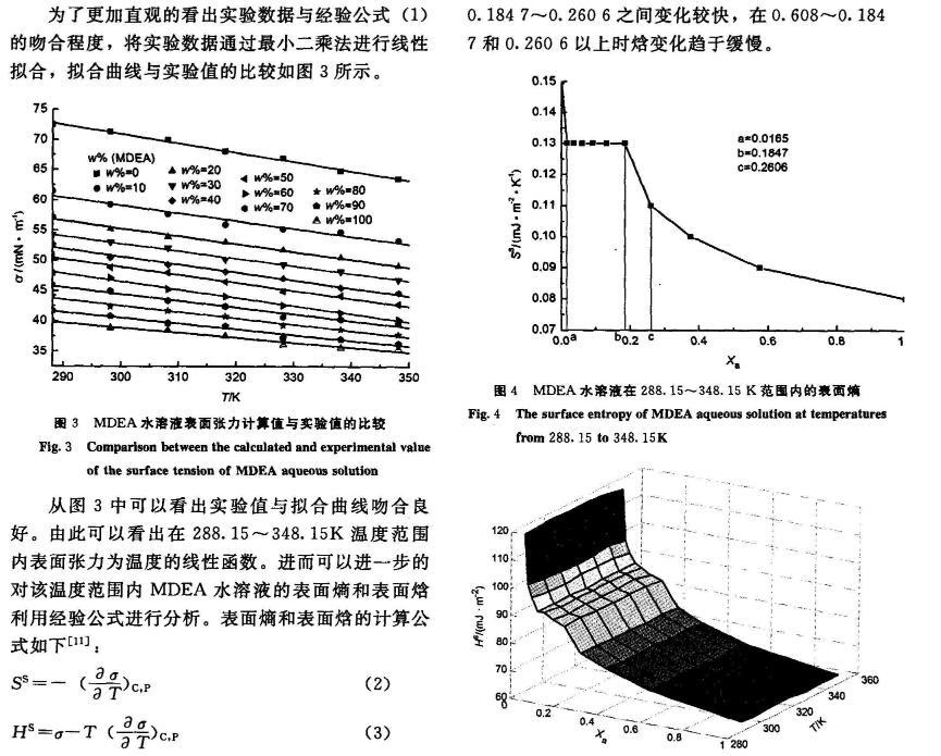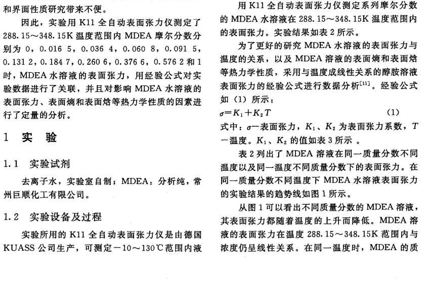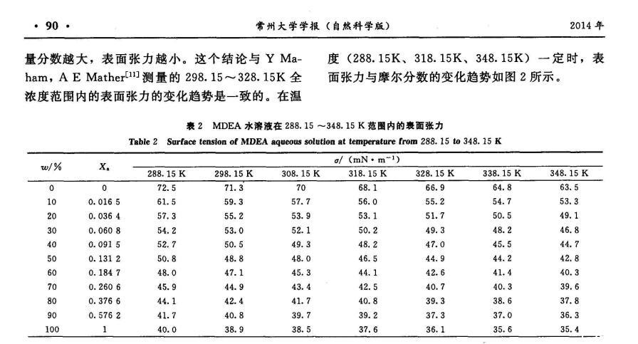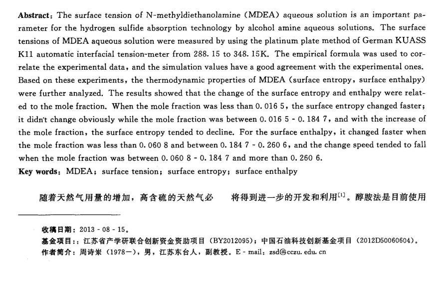 【摘要】:N-甲基二乙醇胺(MDEA)水溶液的表面張力是硫化氫醇胺吸收工藝的一個(gè)重要參數(shù)。用德國KUASS K11全自動(dòng)界面張力儀的鉑金板法測(cè)定了288.15~348.15K全濃度范圍內(nèi)的MDEA水溶液的表面張力,并用經(jīng)驗(yàn)公式對(duì)實(shí)驗(yàn)數(shù)據(jù)進(jìn)行了擬合,擬合曲線與實(shí)驗(yàn)值吻合良好。在此基礎(chǔ)上對(duì)MDEA的熱力學(xué)性質(zhì)(表面熵,表面焓)進(jìn)行了進(jìn)一步分析,結(jié)果表明,表面熵在摩爾分?jǐn)?shù)為0.016 5以下時(shí)熵變化較快,在0.016 5~0.184 7之間變化不明顯,但隨著摩爾分?jǐn)?shù)的繼續(xù)增加表面熵呈下降趨勢(shì)。表面焓在摩爾分?jǐn)?shù)為0.060 8以下和0.184 7~0.260 6之間變化較快,在0.060 8~0.184 7和0.260 6以上時(shí)焓變化趨于緩慢。