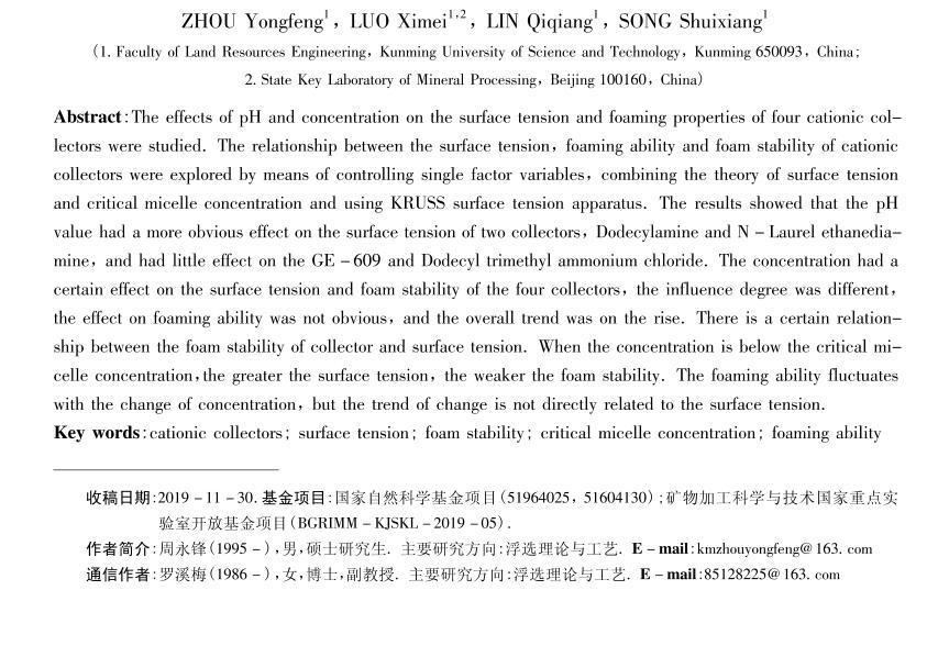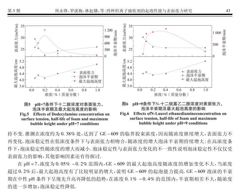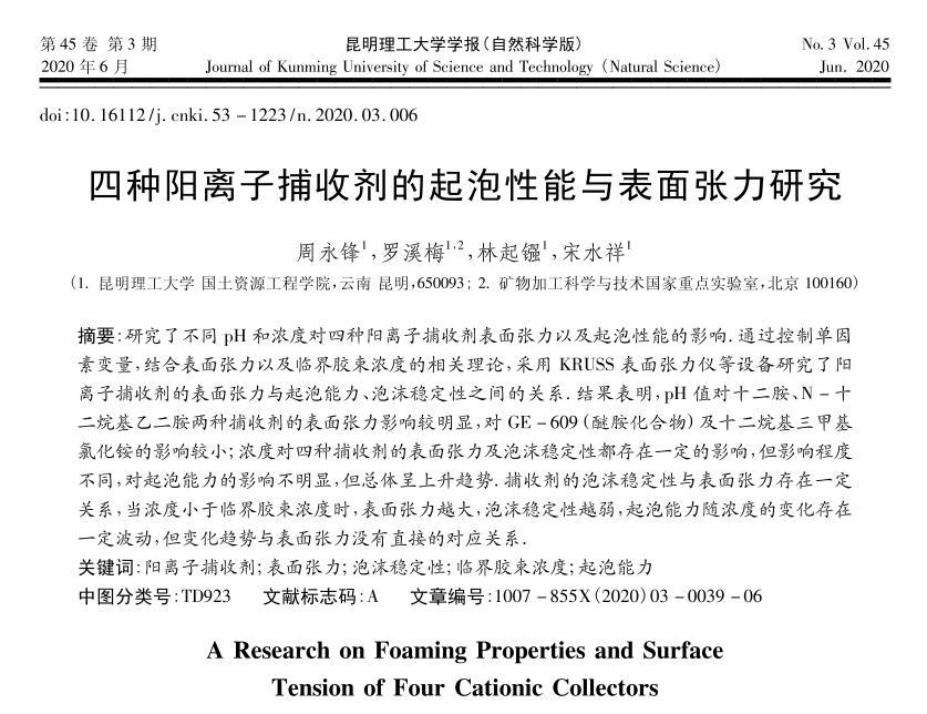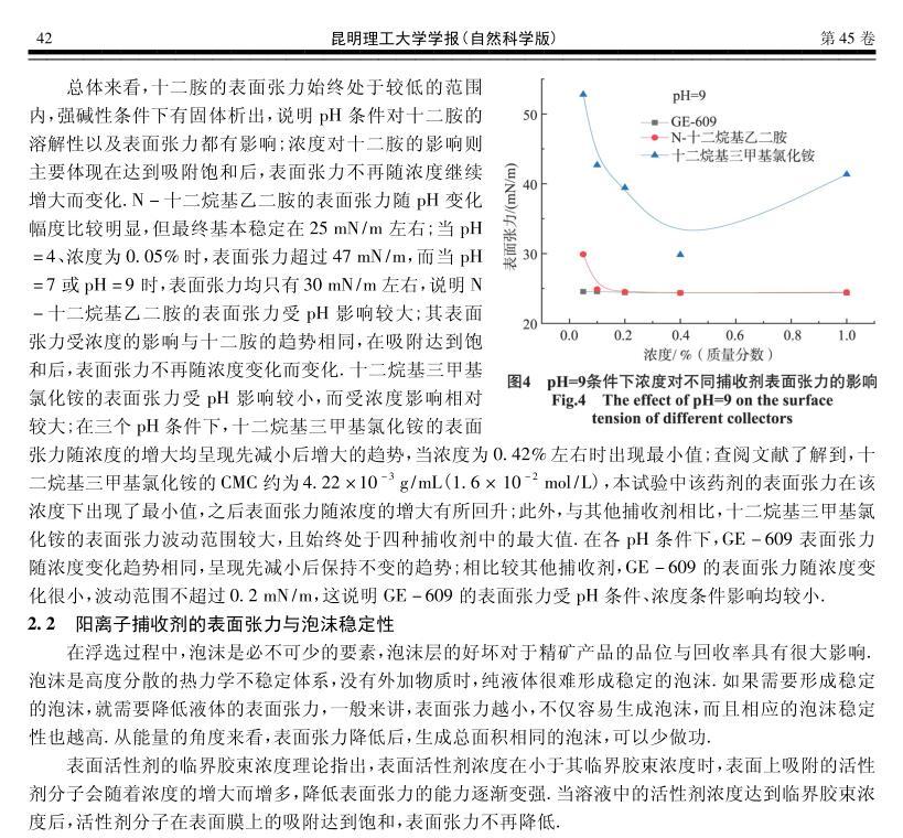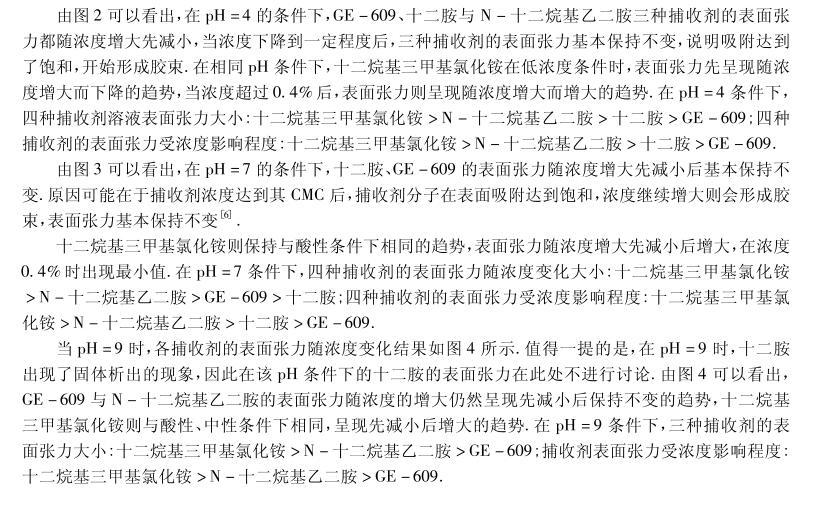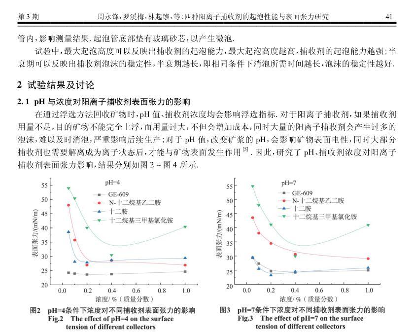 四種陽(yáng)離子捕收劑的起泡性能與表面張力研究