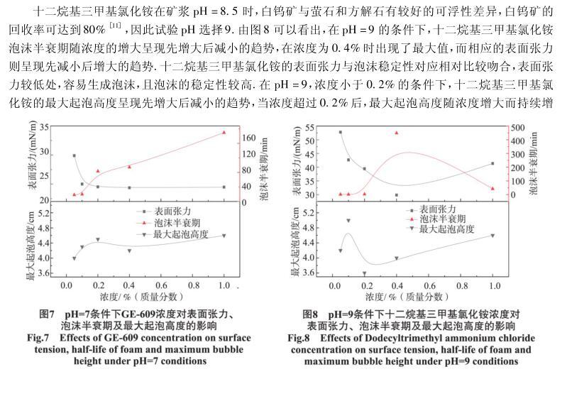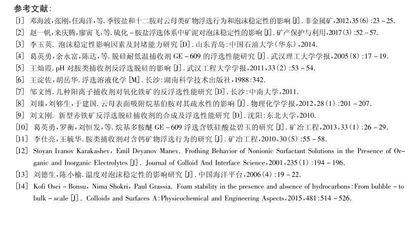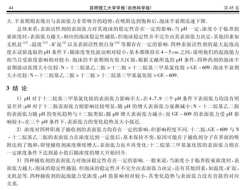 【摘要】:研究了不同pH和濃度對(duì)四種陽(yáng)離子捕收劑表面張力以及起泡性能的影響.通過(guò)控制單因素變量,結(jié)合表面張力以及臨界膠束濃度的相關(guān)理論,采用KRUSS表面張力儀等設(shè)備研究了陽(yáng)離子捕收劑的表面張力與起泡能力、泡沫穩(wěn)定性之間的關(guān)系。結(jié)果表明,pH值對(duì)十二胺、N-十二烷基乙二胺兩種捕收劑的表面張力影響較明顯,對(duì)GE-609(醚胺化合物)及十二烷基三甲基氯化銨的影響較小;濃度對(duì)四種捕收劑的表面張力及泡沫穩(wěn)定性都存在一定的影響,但影響程度不同,對(duì)起泡能力的影響不明顯,但總體呈上升趨勢(shì)。捕收劑的泡沫穩(wěn)定性與表面張力存在一定關(guān)系,當(dāng)濃度小于臨界膠束濃度時(shí),表面張力越大,泡沫穩(wěn)定性越弱,起泡能力隨濃度的變化存在一定波動(dòng),但變化趨勢(shì)與表面張力沒(méi)有直接的對(duì)應(yīng)關(guān)系。