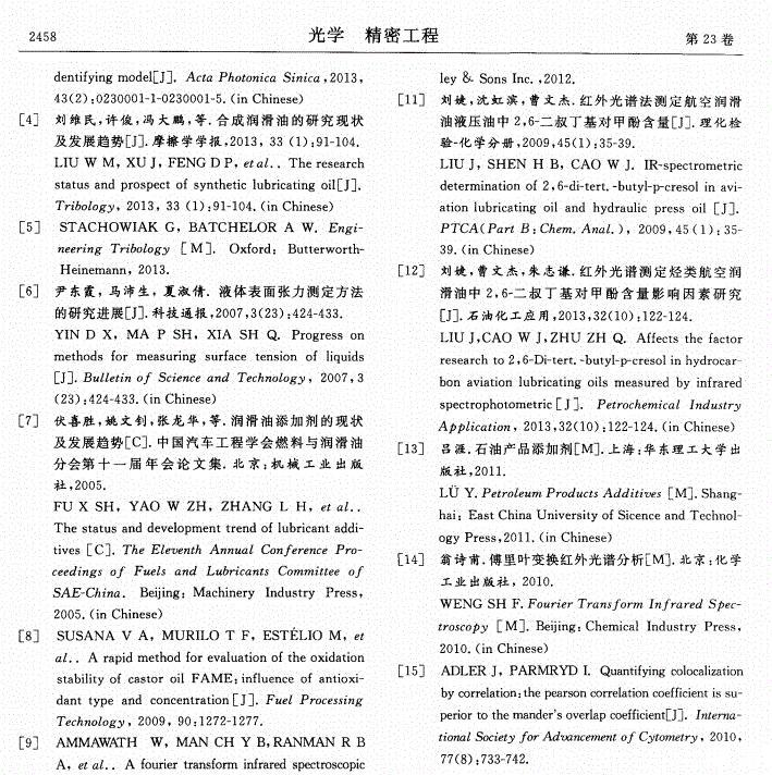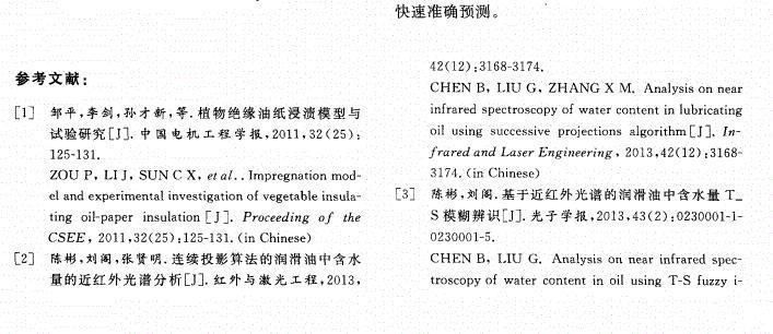 【摘要】:為了有效監(jiān)控絕緣油的運(yùn)行狀態(tài),采用定量分析方法探討了微量水分對(duì)絕緣油表面張力的影響規(guī)律。通過(guò)配制不同微水含量的絕緣油樣,對(duì)每組油樣進(jìn)行表面張力測(cè)試,然后對(duì)油樣進(jìn)行紅外光譜掃描,獲取了油樣中水分在特征波數(shù)處(1 640,3 400,3 450,3 615cm-1)的吸光度值。分析了油液中2,6-二叔丁基對(duì)甲酚(T501)等添加劑對(duì)油樣表面張力變化規(guī)律的影響。結(jié)果表明:油樣中水分含量與水分特征吸光度值之間有較好的相關(guān)性(相關(guān)系數(shù)分別為0.964 1,0.984 8,0.984 5,0.944 0),油樣表面張力和1 640,3 400,3 450,3 615,3 650cm-1波數(shù)處油樣吸光度值的變化亦均呈現(xiàn)良好的正相關(guān)性。建立了油樣表面張力與特征波數(shù)處油樣吸光度值的多元線性回歸模型,擬合精度為0.992 8;根據(jù)模型得到的表面張力計(jì)算值與實(shí)際測(cè)量值誤差為-0.07~0.06%,吻合性較好。文中的實(shí)驗(yàn)可為含微水絕緣油的表面張力檢測(cè)提供理論支撐。