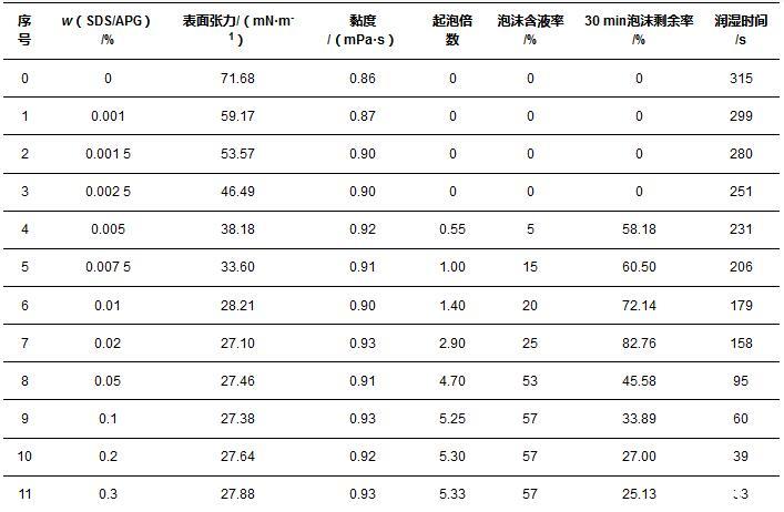 2)在SDS和APG構(gòu)成的表面活性劑體系中,溶液表面張力的降低,有利于起泡、泡沫攜液、泡沫穩(wěn)定性和潤濕能力的提升。當(dāng)質(zhì)量分?jǐn)?shù)大于cmc時,表面張力幾乎不變;在測定范圍內(nèi),隨著質(zhì)量分?jǐn)?shù)增加,溶液起泡能力呈現(xiàn)先增加后平穩(wěn)的趨勢,泡沫穩(wěn)定性降低,潤濕性能提升。