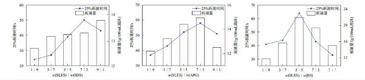 實驗測得SLES,SDS,APG和BS在w=0.2%時的25%析液時間依次為33,30,21和25 s,100 mL泡沫析液量依次為15.97,12.92,13.69和10.89 g。由圖4可知,SLES/SDS無明顯增效,隨著SLES質(zhì)量分?jǐn)?shù)的增加,復(fù)配組分的析液量和25%析液時間接近SLES單組分。SLES/APG的25%析液時間增加,泡沫穩(wěn)定性較好,其中w(SLES):w(APG)=7:3的25%析液時間、100 mL泡沫析液量依次為58 s、14.92 g。SLES/BS的析液量和泡沫穩(wěn)定性均有所提升,其中w(SLES):w(BS)=5:5的25%析液時間、100 mL泡沫析液量依次為64 s、21.95 g。