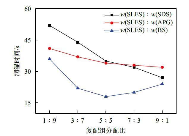 實驗測得SLES,SDS,APG和BS在w=0.2%時的潤濕時間依次為26,102,39和42 s。由圖5可知,SLES與SDS、APG復(fù)配時,潤濕性能未表現(xiàn)出明顯的增效作用,潤濕時間的降低可歸因于SLES的潤濕能力更好,因此隨著SLES組分的增加,復(fù)配溶液的潤濕時間降低。SLES與BS復(fù)配時,潤濕能力表現(xiàn)出明顯的增效作用,當(dāng)質(zhì)量分?jǐn)?shù)比為5:5時,潤濕時間為18 s,低于兩種單一物質(zhì)的潤濕時間。