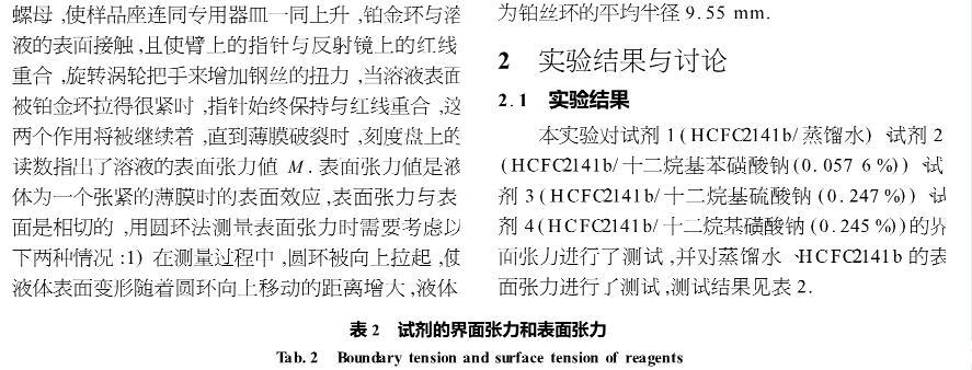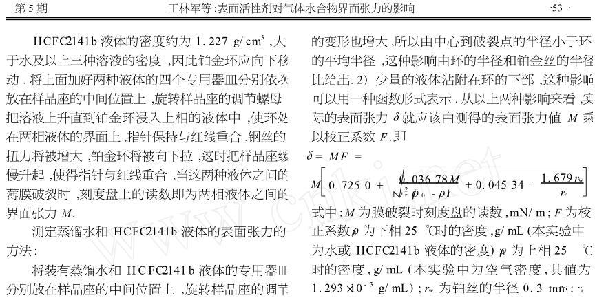 【摘要】:表面活性劑能夠減小液體的表面張力以及兩相液體間的界面張力,界面張力的減小有利于促進氣體水合物快速形成和提高水合物儲氣能力.為定量研究兩相液體間界面張力對氣體水合物形成的影響,用界面張力儀實測不同溫度時蒸餾水、HCFC-141b的表面張力以及HCFC-141b/蒸餾水、HCFC-141b/十二烷基硫酸鈉溶液(0.247%)、HCFC-141b/十二烷基磺酸鈉溶液(0.245%)、HCFC-141b/十二烷基苯磺酸鈉溶液(0.057 6%)的界面張力,測試結(jié)果表明,表面活性劑對降低兩相液體間界面張力的作用十分明顯,其中十二烷基苯磺酸鈉溶液對降低界面張力最為突出,降到HCFC-141b/蒸餾水界面張力值的9%左右,為定量研究氣體水合物等優(yōu)選表面活性劑提供了科學(xué)的依據(jù)。