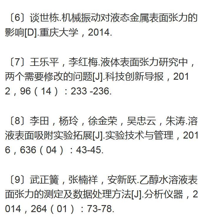 【摘要】:對于最大泡壓法測定表面張力的實驗,我們通過調(diào)整冒泡速度對其進行實驗探索。實驗測試了冒泡速度分別為3,5,7,9,11s/個時,乙醇與異丙醇兩種溶液在濃度為10%,20%,30%,40%,50%時表面張力的大小。結果顯示,不同濃度的乙醇與異丙醇溶液,當冒泡速度為11s/個時,這兩種溶液的表面張力值最接近理論值。因此在測定表面張力的實驗時冒泡速度控制在10s/個以上,所得數(shù)據(jù)更精確。通過初步探索為表面張力實驗的教學改進提供了依據(jù)。