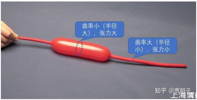 氣球內(nèi)部的氣體壓力處處相等,但是,接觸過這種氣球的人都有一個經(jīng)驗,就是粗的地方繃得緊,而細(xì)的地方繃得就不那么緊。如上圖所示,繃得緊的地方和繃得松的地方,產(chǎn)生的壓力差是相等的,但是他們的曲率是不相等的:曲率越大,同樣的張力所能產(chǎn)生的壓力差就更大。