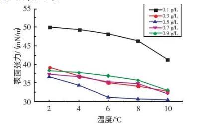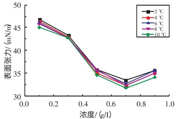 2.2.1不同溫度下十二烷基苯磺酸鈉溶液表面張力與濃度的關(guān)系實驗研究了在溫度為2、4、6、8、10℃條件下,SDBS溶液的表面張力與濃度的關(guān)系(見圖3)。由圖3可知,當濃度在0.1~0.7 g/L時,隨著SDBS溶液濃度的升高,其表面張力逐漸減小;當濃度在0.7~0.9 g/L時,隨著SDBS溶液濃度的升高,其表面張力逐漸增大。當SDBS溶液濃度為0.7 g/L時,其表面張力取得最小值。