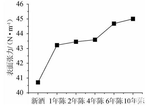 采用表面張力評(píng)價(jià)黃酒隨陳釀時(shí)間的變化,結(jié)果表明,黃酒的表面張力隨著陳釀時(shí)間整體呈上升趨勢(shì),黃酒的表面張力與陳釀時(shí)間具有顯著的高度正相關(guān)關(guān)系。