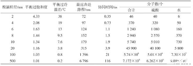 若冷凝酸初始粒徑為8 nm,由2 940個(gè)分子組成,平衡過飽和度1.44,酸滴表面飽和蒸氣壓增大44%,對(duì)應(yīng)的平衡過冷溫差9.5℃。在超額過飽和溫差10.5℃下,等于氣相過冷了約20℃,平衡過飽和度、超額過飽和度各半,此時(shí)酸滴中分子最遠(yuǎn)奔赴路程150 nm,對(duì)應(yīng)的協(xié)同時(shí)間是1.5 ns,酸滴間最近距離是0.3μm。