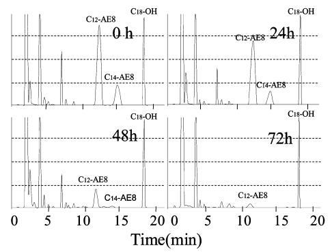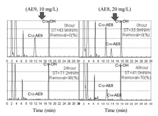 使用商用 AE8 進行生物降解測試獲得的結(jié)果如圖 9 所示,其中 C12-AE8 和 C14-AE8 的峰分別在保留時間 11 分鐘和 14 分鐘附近觀察到。 觀察到18分鐘內(nèi)標峰和8分鐘前的干擾峰以及圖8中AE9的結(jié)果。24小時后觀察到AE8峰面積減少,72小時峰消失。 144 小時(6 天)后表面張力值達到約 72.8 mN/m,而生物降解率僅為 45%,死亡率在 48 小時時降至 0%(圖 5)。 與 10 mg/L AE9 的結(jié)果相似,20 mg/L AE8 的水生毒性在基于需氧量的生物降解增加到 50% 之前消失。
