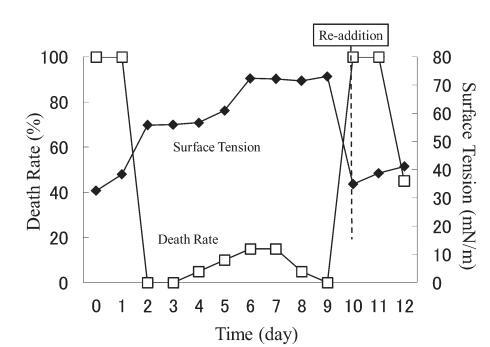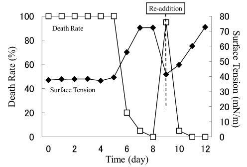 結(jié)果,在第8天重新加入LAS使試液的表面張力降低到與初始階段相同的水平,但死亡率沒有達到100%。 重新添加后不久,觀察到表面張力值迅速增加,水生毒性和死亡率迅速下降。 重新添加 LAS 后,死亡率暫時增加,但隨后立即降至 0%。 重新添加后第 2 天,表面張力值達到約 72.8 mN/m。