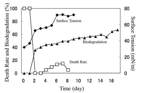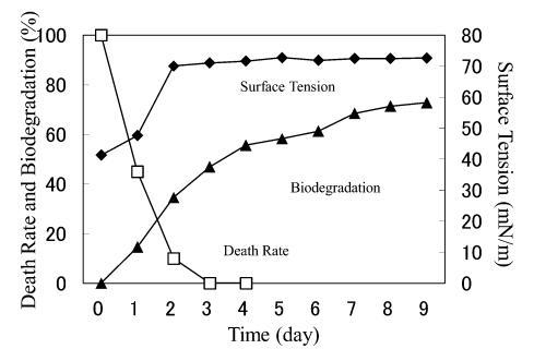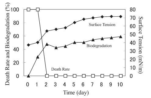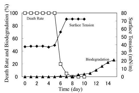 AE 的生物降解速度比 LAS 快。 對于 10 mg/L AE9,BOD 和表面張力值在測試開始后立即開始增加,死亡率立即下降(圖 3)。 表面張力值在第 2 天達到約 72.8 mN/m。 該結(jié)果與之前的報告一致9),其中比較了基于 CO2 量的生物降解率(測量的 CO2 產(chǎn)量/理論 CO2 產(chǎn)量)和 CTAS 的降低率。 也就是說,Strum 研究中 CTAS 的降低對應于我們研究中表面張力值的增加。