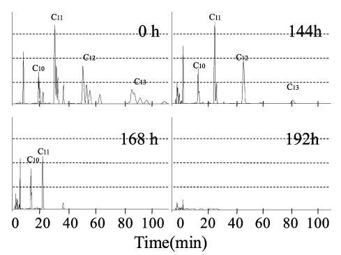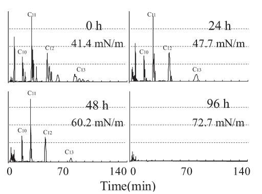 生物降解過程中10mg/L LAS的色譜圖,通過HPLC使用UV檢測器進行分析,如圖6所示。在相應的保留時間(RT)處出現(xiàn)不同碳鏈數(shù)的峰組:16至19.5分鐘為C10,26.5至32.5分鐘是C11,44到55分鐘是C12,74到95分鐘是C13。 由于苯基的結(jié)合位置不同,每個峰組都包含異構(gòu)體峰。 參考標準(和光純藥工業(yè)株式會社)用于識別每個峰。