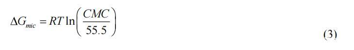 其中 R 是氣體常數(shù),NA 是阿伏伽德羅數(shù),T 是絕對(duì)溫度,并且 n 是溶質(zhì)種類的數(shù)量,我們可以將其設(shè)置為 1。 膠束化的自由能 (ΔGmic) 由等式 (3) 計(jì)算。