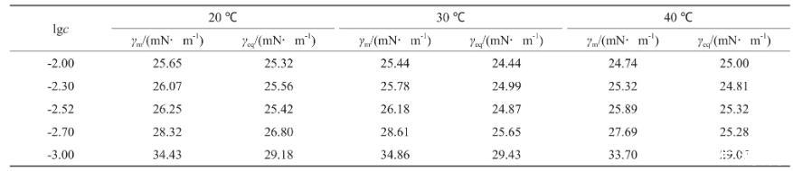 采用JK99C型表面張力儀由低濃度至高濃度測定恒溫后系列溶液的表面張力(γ),做γ-lgc(c為濃度)曲線。測試均在帶有恒溫夾套的玻璃杯中進行,外接數(shù)控超級恒溫槽,溫度控制在預設溫度,溫度選擇為20,30,40℃。