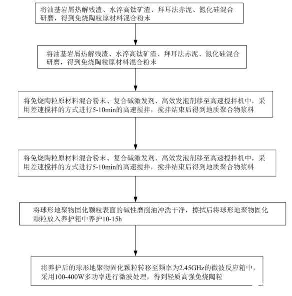 本發(fā)明一種油基巖屑-高鈦礦渣-赤泥基輕質(zhì)高強(qiáng)免燒陶粒及其制備方法,本發(fā)明使用油基巖屑熱解殘?jiān)⑺愀哜伒V渣、拜爾法赤泥作為免燒陶粒的主要原材,能夠促進(jìn)其地質(zhì)聚合反應(yīng)的發(fā)生,增強(qiáng)對(duì)油基巖屑?xì)堅(jiān)鼉?nèi)重金屬離子的固化;