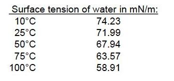 2、同種液體,在不同溫度時(shí)表面張力會(huì)不同比如下面表格溫度越低表面張力越大;