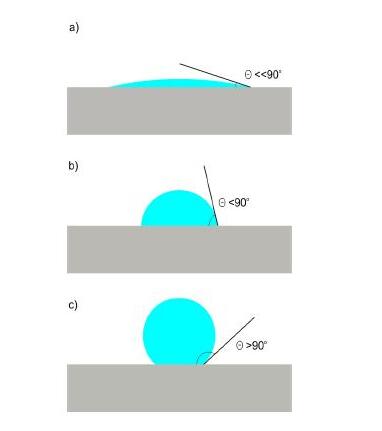 由于接觸角的不同和浸潤(rùn)與非浸潤(rùn)的情況就可以解釋題主所說(shuō)的完全不同的水滴效果常見(jiàn)的有下圖三種情況;