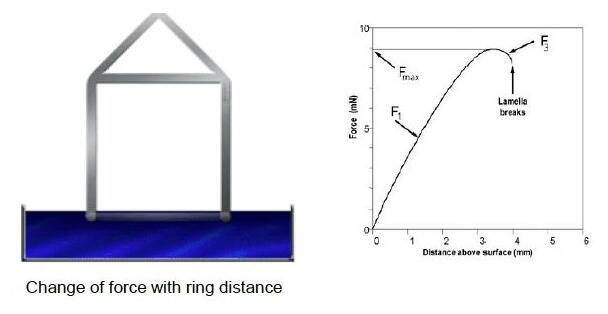 由于距離不同表現(xiàn)出的表面張力也不同,因此測(cè)量往往取最大值,也就是右方圖中的Fmax