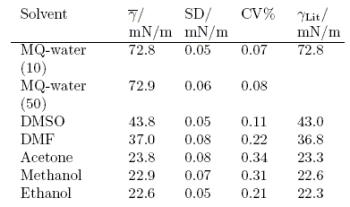 下表列舉了幾種廣為人知的溶劑的表面張力數(shù)據(jù)來闡述了Kibron傳感器的準(zhǔn)確性和精確性,每種溶劑都連續(xù)測定5次并且利用常規(guī)的統(tǒng)計學(xué)方法來分析相關(guān)數(shù)據(jù)。對表面張力的均值進行了一個比較,結(jié)果和文獻值是相一致的。